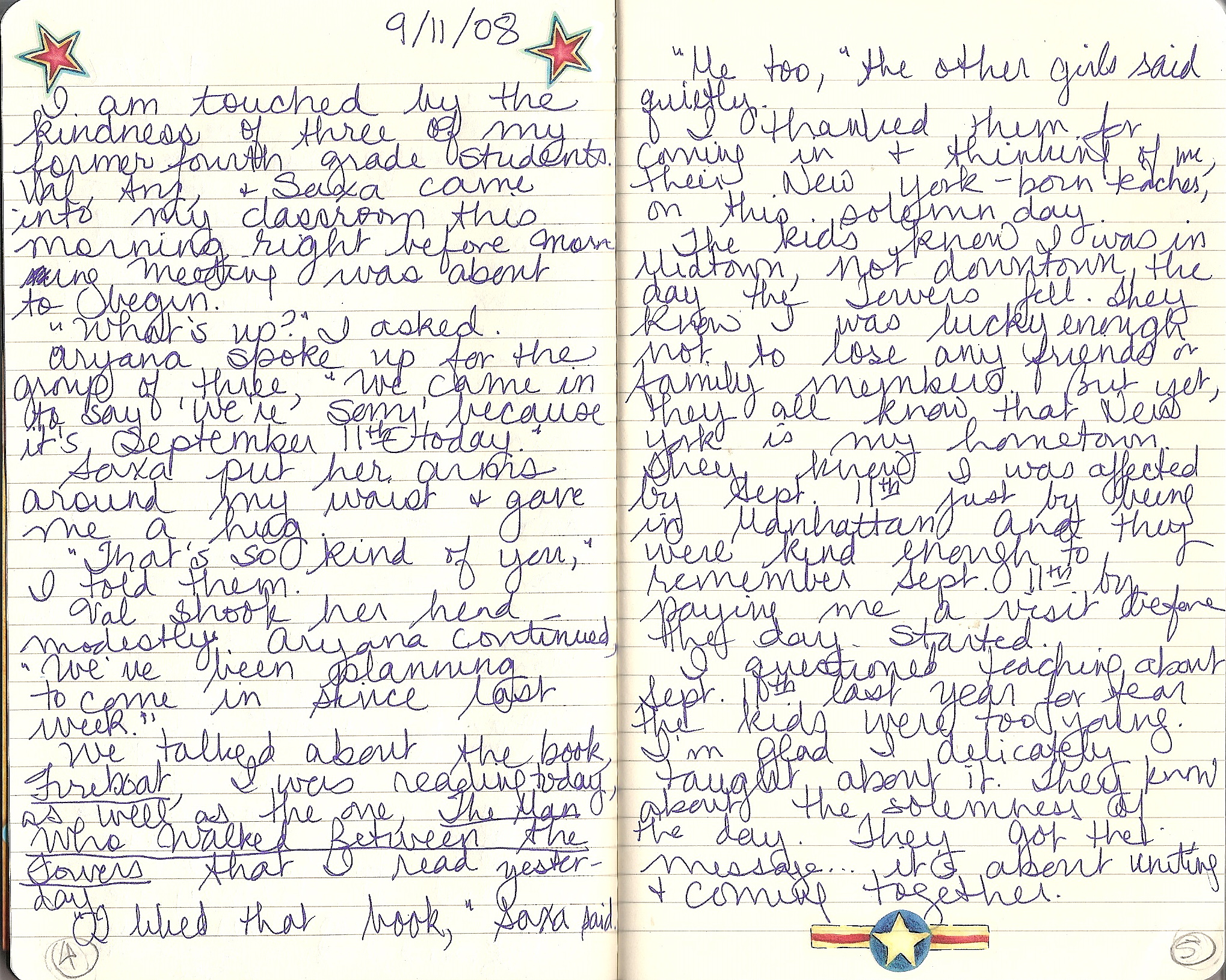 I found myself amazed by something three of my former students did for me today. You can read my writer’s notebook entry (below), which I scribbled out during my preparation period this morning, since I didn’t want my appreciation for these three precious souls to fade. I wanted to capture the amazing act of kindness they extended to me, a New Yorker, on the seventh anniversary of September 11th. I hope you will be as amazed with their thoughtfulness as I was…