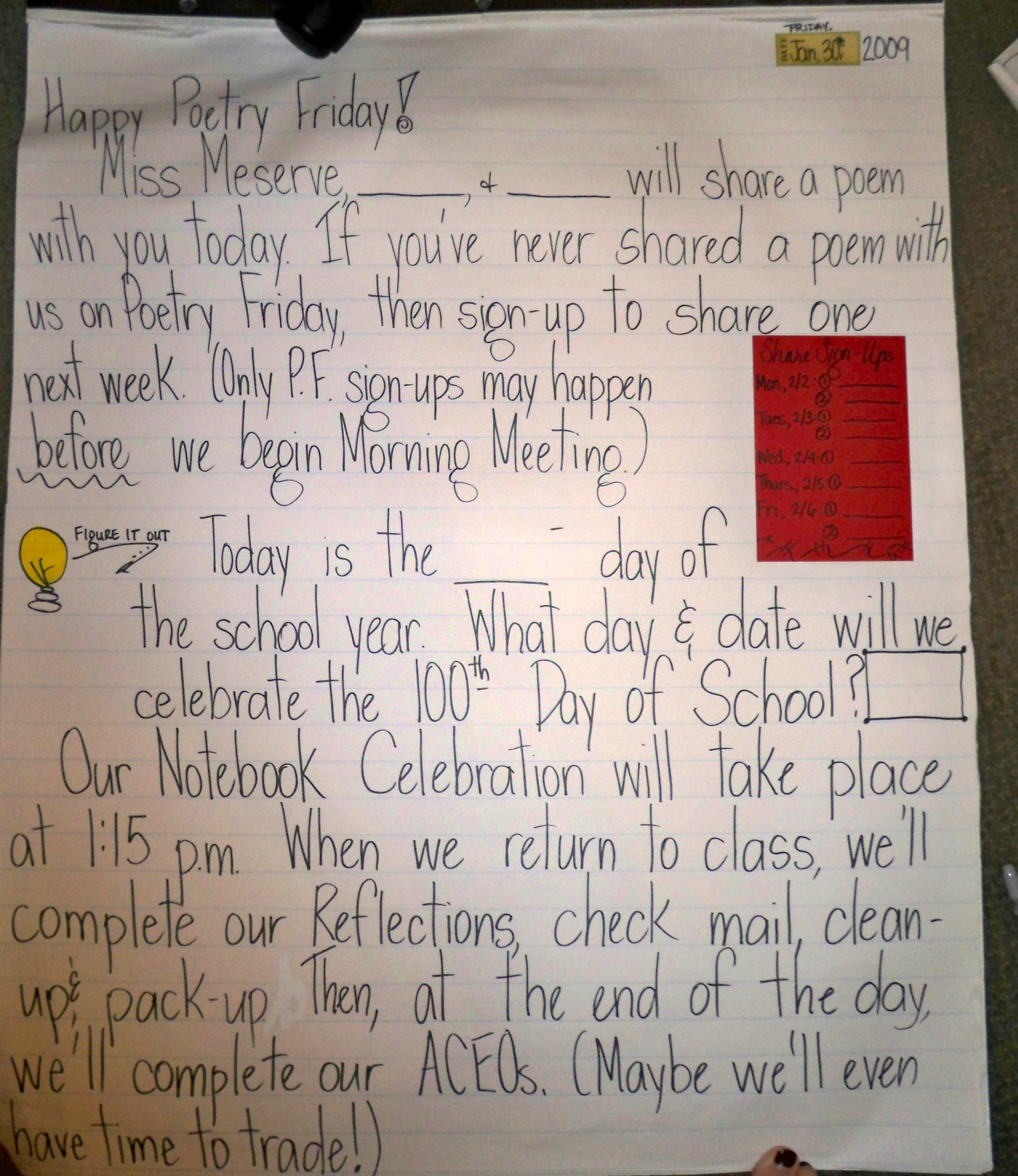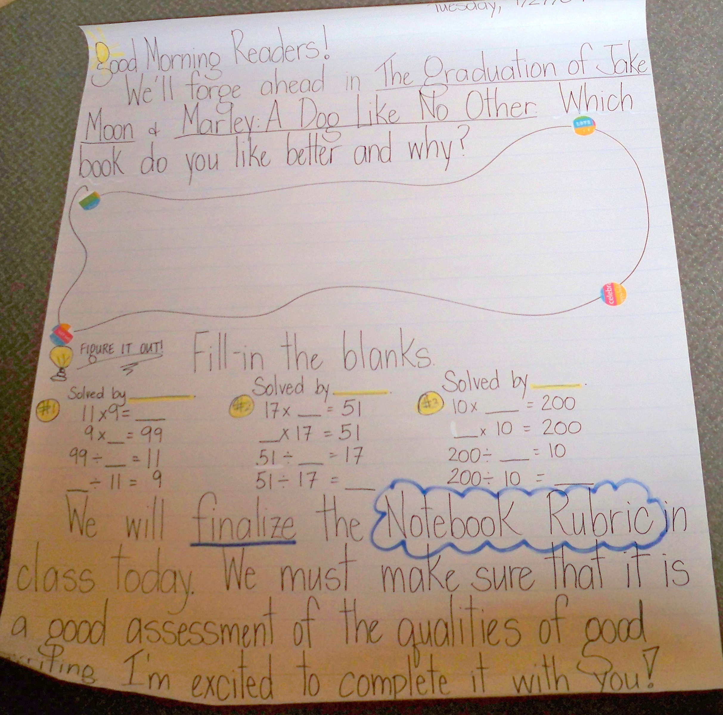 It’s hard to plan ahead for something you know you’re going to let the students form. However, I placed a notice on Monday and Tuesday’s Morning Meeting Charts. I also put together a guide to what a 4, 3, 2, and a 1 means. Finally, I created a chart that explains what I think makes a good piece of notebook writing.