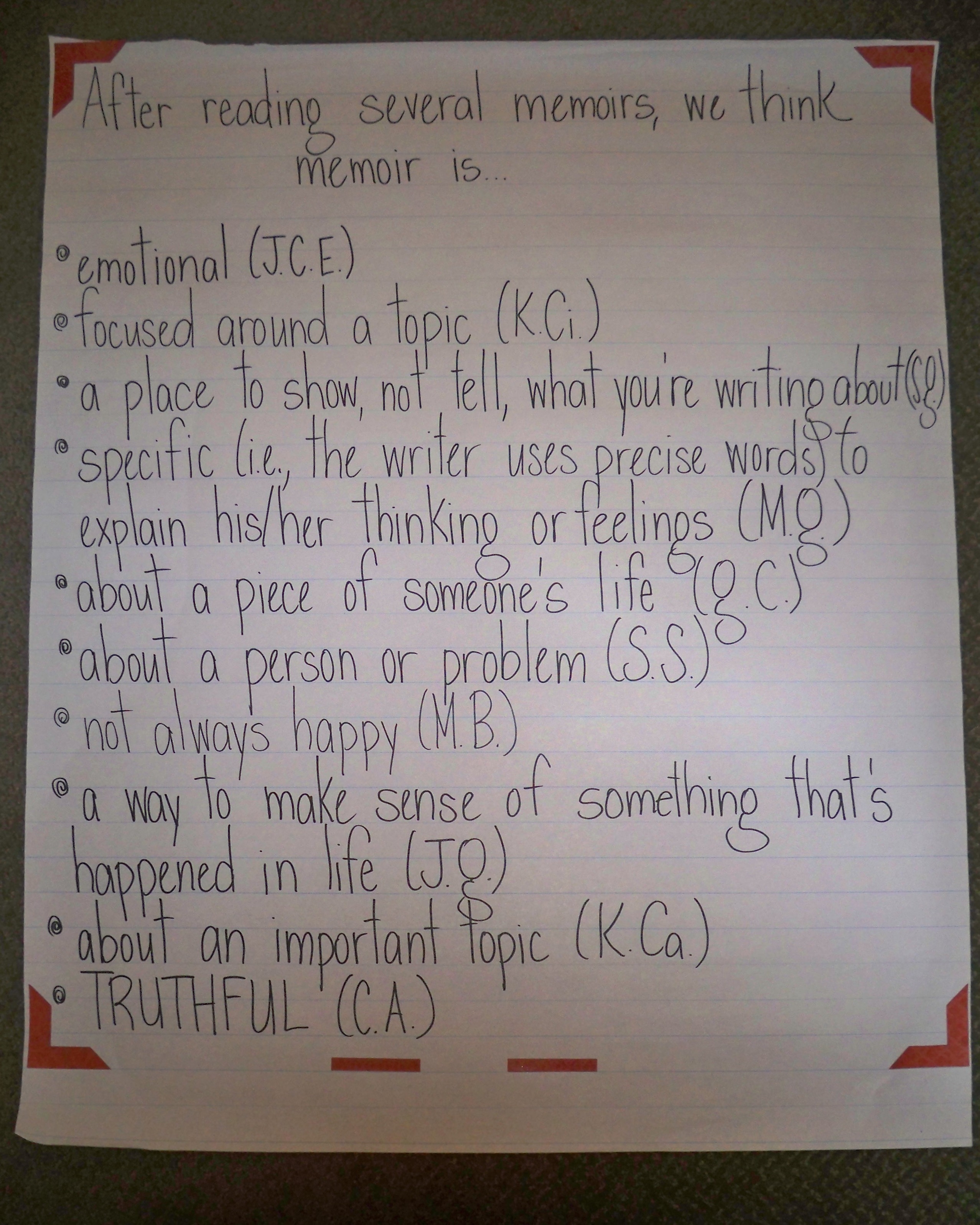 My kids' noticings about memoir from the two days we spent immersing ourselves in the genre.