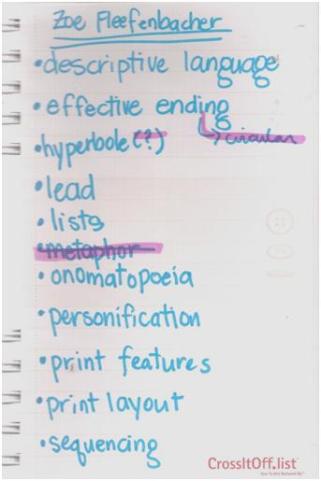 A copy of Laurie Halse Anderon‘s The Hair of Zoe Fleefenbacher Goes to School arrived at my home last week. I read it once and put it aside since I was unsure of what this book would be most suitable for teaching (i.e., there’s so much it can be used for!). I took a week away from Fleefenbacher and turned back to Susan Ehmann and Kellyann Gayer’s I can write like that! A Guide to Mentor Texts and Craft Studies for Writings’ Workshop, K – 6 before cracking it the picture book open again. I reviewed all of the craft elements Ehmann and Gayer define in their book (pgs. 9 – 25) and made a list of the ones I thought I remembered being present in the text.