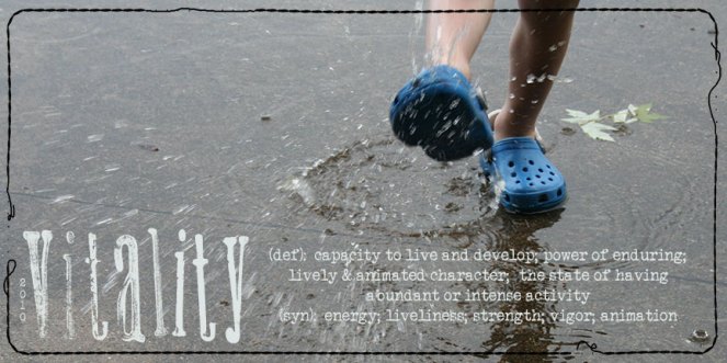 Every year I learn something unexpected about the word I chose. In the first quarter of 2010, I’ve learned vitality is influenced by my state of mind. Part of the definition of vitality is: the state of having abundant energy. I thought I’d be learning about being physically fit, eating healthy, and sleeping regular hours. Surprisingly, vitality is requiring me to take a good look at my attitude.