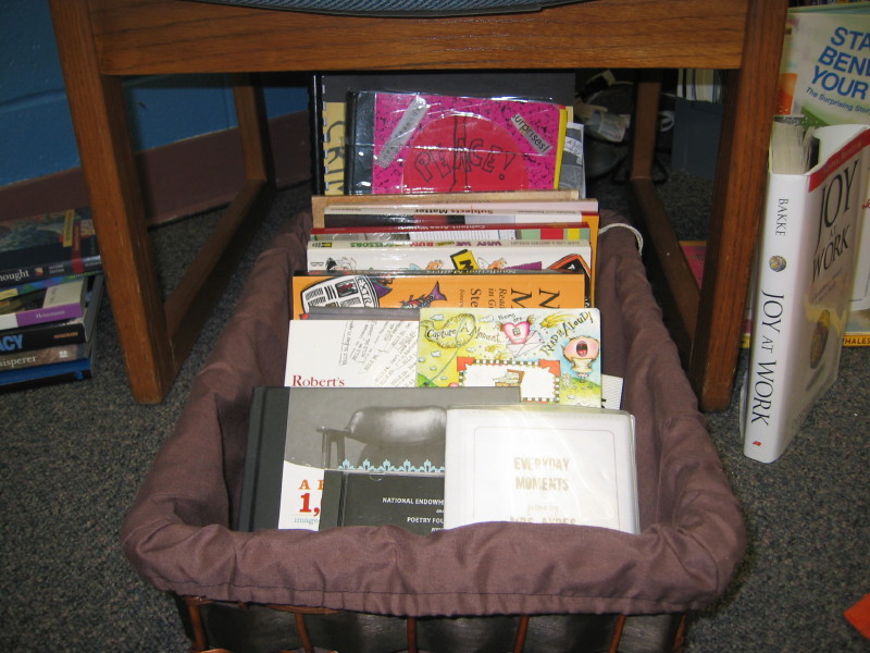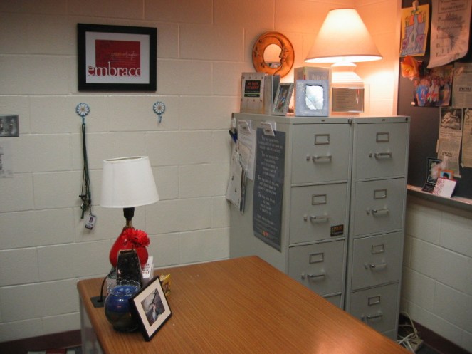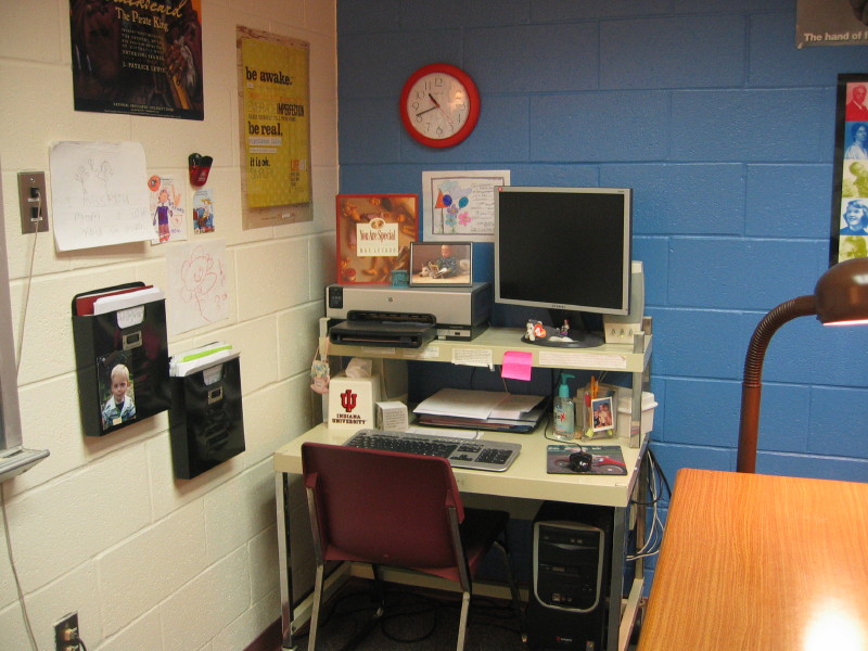 Because I am not 100% Type A Personality, there is this area, behind my door that serves as a “holding tank” for things that need filed. See that lovely stack? Yeah, that’s all of my high school curriculum work. See my good intentions? There are binders and tabbies and everything all ready for when I have time to organize. Considering almost all of this is filed electronically on my computer, it is not a big priority for me. The thing I need to do is scan the student work. I’m not so good at that. Oh well, it gives me a goal.