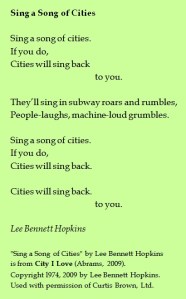Katie Wood Ray’s Wondrous Words changed my writing life in a profound way. Where I once saw blank paper, I now see endless possibility. And while I highlight list, circular, and back-and-forth structures above, you can read about many more patterns and learn how to recognize others in her groundbreaking book. Katie explains, “Picture books are short, and so considering a structure at work in a shorter text is much easier than in a longer text….Once writers get an initial understanding of a certain crafted text structure, they will recognize the structure in many other texts.” Poems are even shorter than picture books, and their structures are often easy to name. When children read Lee’s circular “Sing a Song of Cities,” they may notice, “The beginning matches the ending!” Ah, a circle. Young writers may ask, “How might I try this out in my own poem or book?”