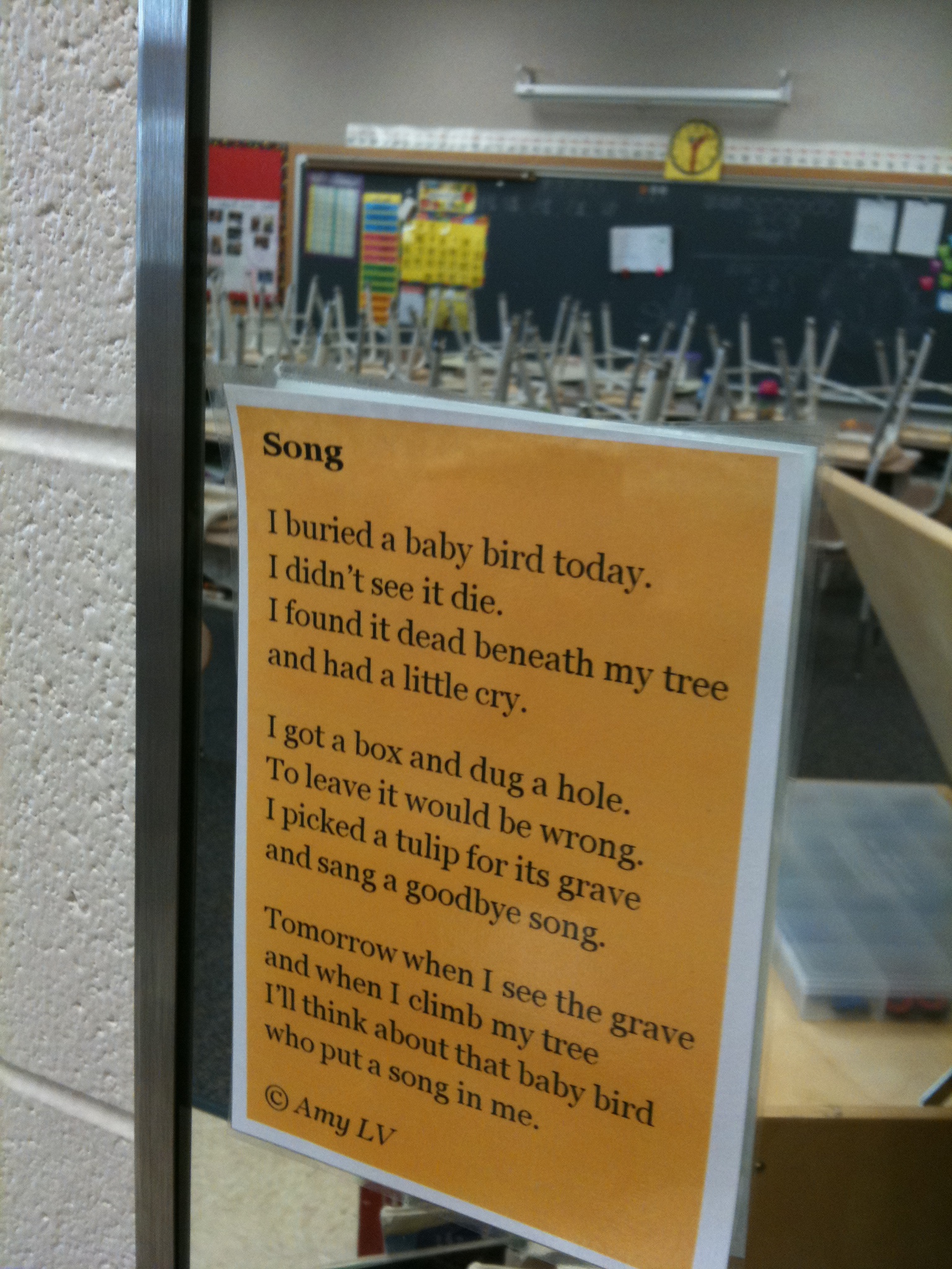 Poetry: I’m working alongside two second grade teachers as they lead their students through a poetry study. The collaboration between Christi and Gretchen is inspiring. They bounce ideas off of each other and then each chooses what is most pressing for their students. Interestingly enough, one classroom has focused on the sound of poetry — creating images and using rich words, while the other has focused on the structure — line breaks and word placement. They are now swapping lesson ideas as each is focusing on the other concept this week. It is evident that there isn’t a single-right-place to begin when planning a unit. What is important is to follow the needs of your students and then provide the appropriate nudges into other important ideas. Both teachers have depended on Amy’s blog, The Poem Farm, for mentor texts. Check out Amy’s poetry around Christi’s room:
