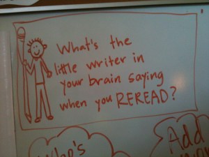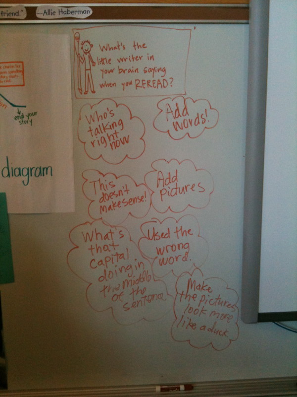I think this concrete image of little writers in their brains made a difference. As they moved into work time, I asked everyone to try out some rereading with a story they were drafting (or recently finished drafting). At the end, we asked students to share what their little writer said to them during rereading.