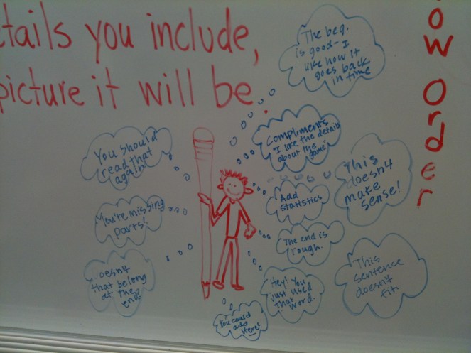 The Little Writer in my brain isn’t like the monsters. The Little Writer is good and tells me important things. I think sometimes young writers think they already know what their writing is about so when they reread they “check out.” The Little Writer can help them focus and pay attention to places revision or editing can take place.