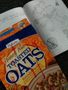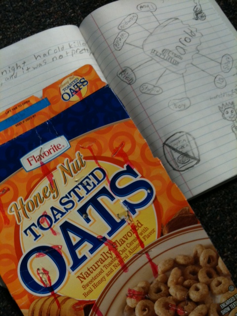 While getting to know characters, one fourth grader brought this cereal box in during the planning stages of writing fiction. He was toying with the play on words of a “cereal killer.” To me, this represents writing work happening outside of the classroom. He was thinking about his story when he was away from his desk. This is a mark of a true writer.