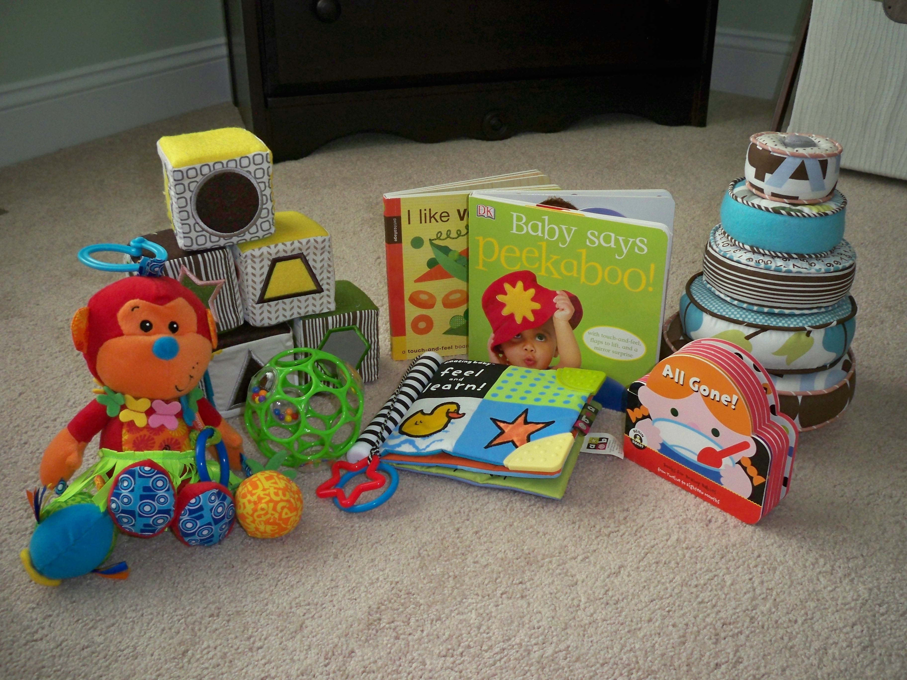 This past weekend I needed to pick up a few feeding-related items for my daughter at Buy Buy Baby. Since Isabelle was sleeping, I found myself weaving through the brightly-lit aisles of the store a little longer than I had planned. I found my way to the toy section, which was incredible. I found myself picking up and inspecting lots of infant toys, many of which claim to have educational benefits. I was amazed to find a whole section of infant flash cards. As intriguing as these flash cards seemed, I passed them by and settled on a neon green ball that makes a rattling sound when the baby shakes it (see bottom left of the photo). After all, Isabelle played with a similar ball at a friend’s house last week and enjoyed the sounds it made when she moved it around in her hands.
