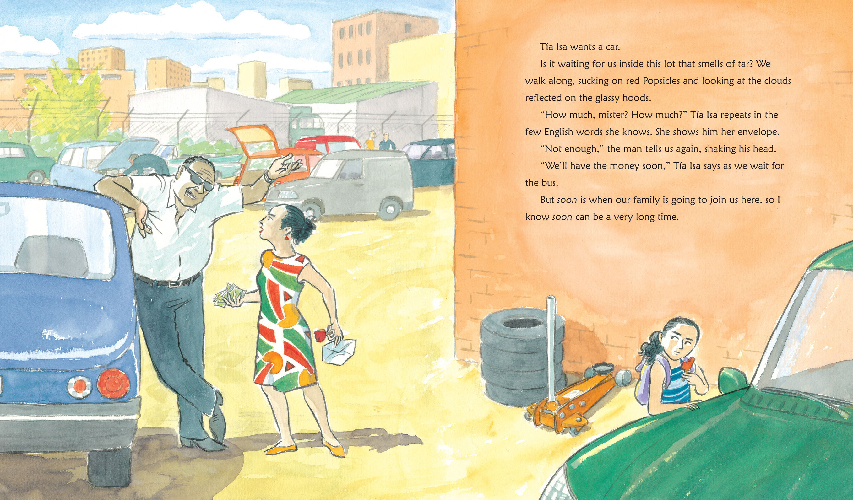 Stacey: You used a repetitive phrase, “Tia Isa wants a car” several times in the book. How do you think the repetition of this line strengthened the story?