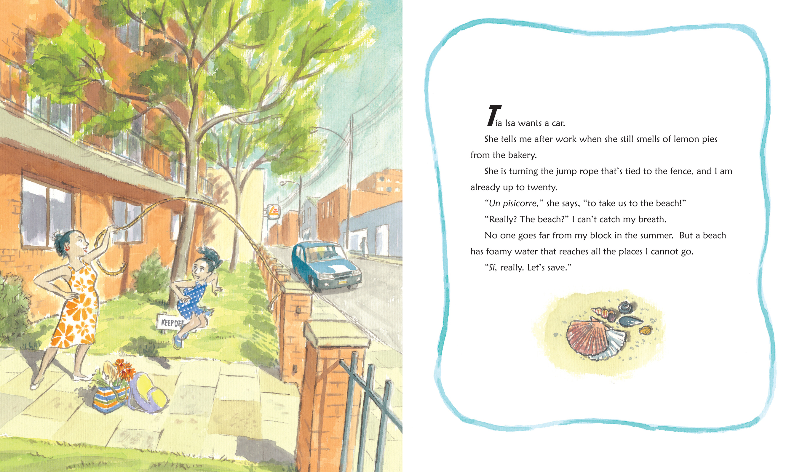 Meg: Writing a picture book is always a partnership between writer and illustrator, so I can’t take all the credit. Claudio’s beautiful illustrations do a lot of heavy lifting in terms of the story. His images fill in what is not said in words. But in terms of text, I’d say it always comes down to the details you choose. I’m very picky in selecting details that work hard for the story in what they suggest. Imagine living in a really tiny, one room apartment. You wouldn’t buy a dining table and a kitchen table and a couch and a bed. Instead, you’d have one table that could be casual or dressy. You’d have a sofa that could turn into a bed, an ottoman to store all your sheets inside. The same kind of double duty is needed for the details you use in a picture book. In Tía Isa, for example, a jump rope is more than a game she’s playing. It’s inexpensive, so anyone can own one. You can find it in city neighborhoods everywhere. It also requires someone to spend time with you in a sort of partnership and rhythm, which worked well for my characters. Also, it’s playful – and who doesn’t love the adult relative who still makes time to play games with us? Those are always our favorites. All of that is part of the idea of “jump rope.” Then there’s the smell of lemon pies that tells us she just got home from work, and that the work isn’t fancy. What it comes down to is building the “world of the story” without clogging up your tale with too much explanation.