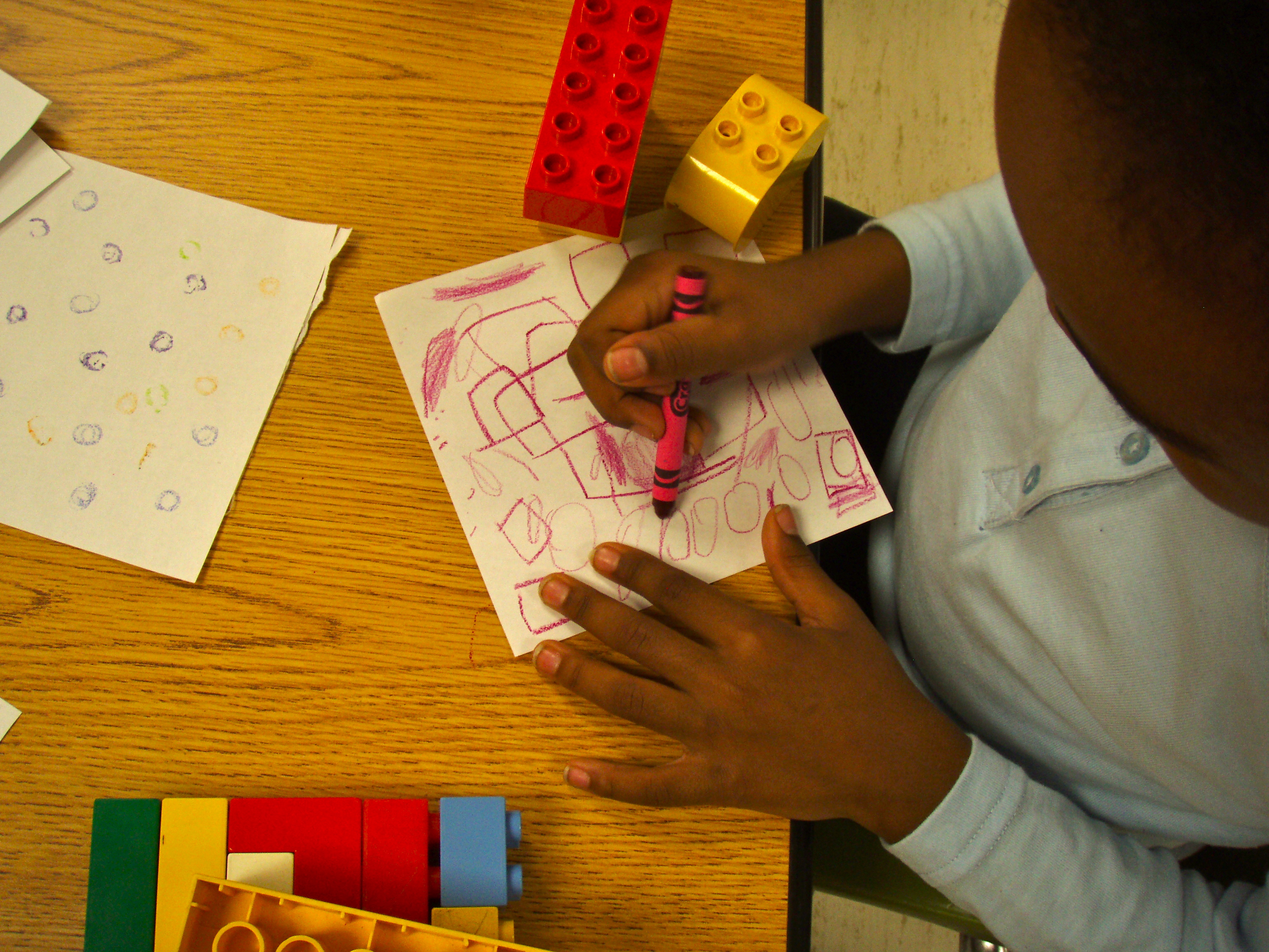 – playing in the writing center, with notebooks, loose paper, stencils, pencils, crayons, and markers;