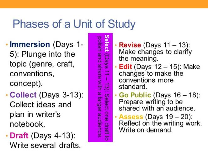 In preparing to talk with teachers about planning a unit of study, I created this chart to help show how I encourage students to individualize the writing process instead of forcing a lockstep approach to the writing process throughout a unit of study. Here are a couple of slides from my presentation: