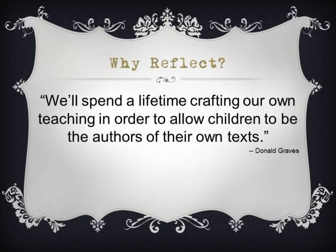 I have a great post to share with you, but it’s late. (Tonight was high school boys’ soccer sectional for our hometown team. We are big soccer fans, so the post is going to have to wait.) Instead I’d like to share a favorite slide from a presentation about reflective practice that I’m giving tomorrow.