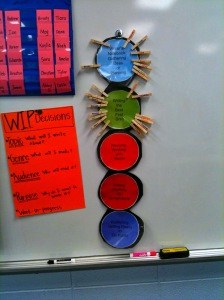 I introduced the third graders to this idea and there were a lot of stabs at trying to figure out this whole drafting thing that writers do. There were some heels dug in — “I am going to make a book and you can’t stop me,” was the body language of one girl. (I thought to myself, I might not stop you this time, but eventually you’ll write drafts.) The following day I brought in this interactive chart. I wanted to help make the process more visible to them, as well as help them individualize it. (The following day we added magnets with each student’s name so they can show where they are working in the writing process.