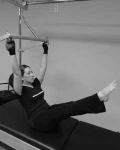 When I take Reformer class, I do “teaser” on the long box. I never seem to be able to get my arms and legs to exactly the right angle. Therefore, I prefer to do “teaser” on a piece of equipment called the Cadillac, which allows me to get some assistance using an overhead bar (pictured). Using a push-through bar allows me to keep my arms at at comfortable position while giving me enough support to help me balance in order to keep my legs in the air. While this could be viewed as a modification, it’s really just another way to do “teaser.” Since a “teaser” is very difficult, the way it looks can vary from person to person. However, the thing that all “teasers” have in common is the angle of the arms and legs and the requirement of balance on a small part of your body.