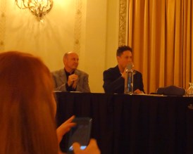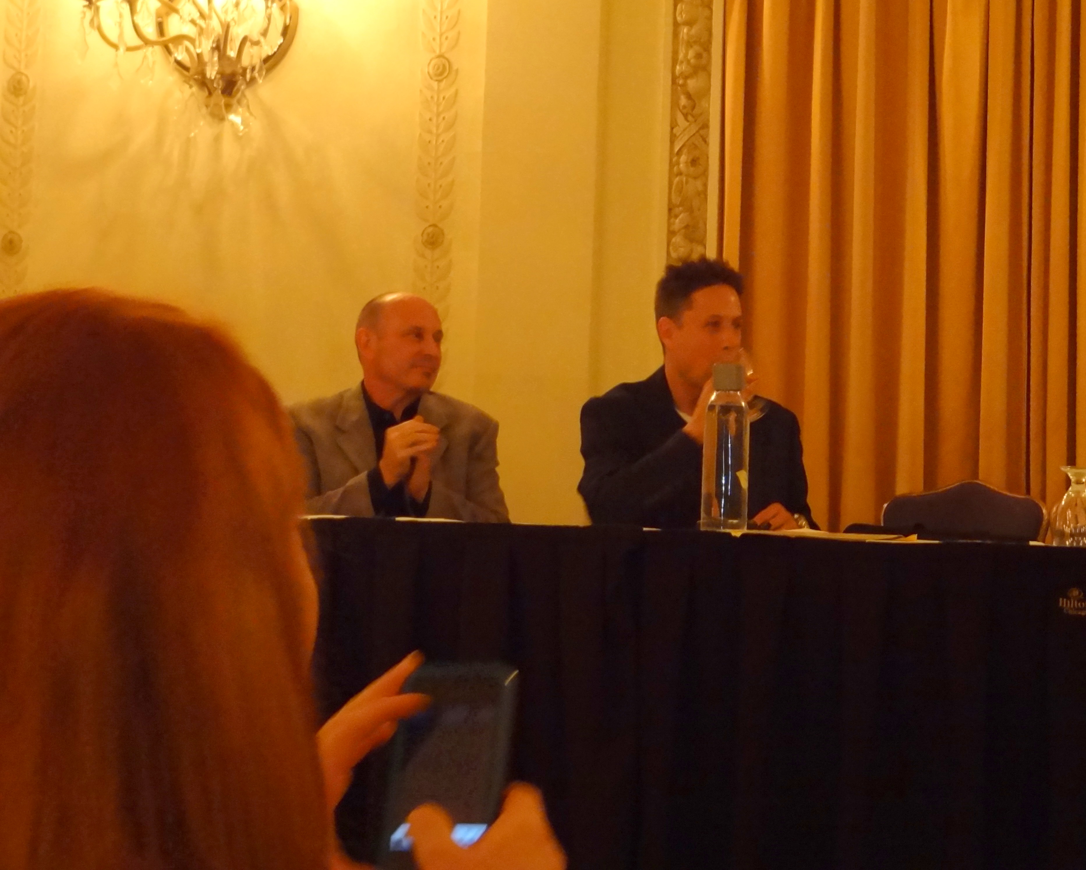 Alan Sitomer (right) takes a drink of water at the end of his speech. On the left is Jon Scieszka.