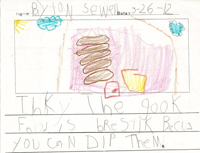 Thank you for sharing this experience and your thoughts surrounding it. I like the two Big Ideas: Writers share their opinions, and, Writers support their opinions with reasons. I will enjoy sharing this with my class (8-9 year olds) who will be delighted to see younger writer’s work and seeing what they can express so precisely in one sentence. I’m now convinced that bread sticks are the goodest food – what a great reason!