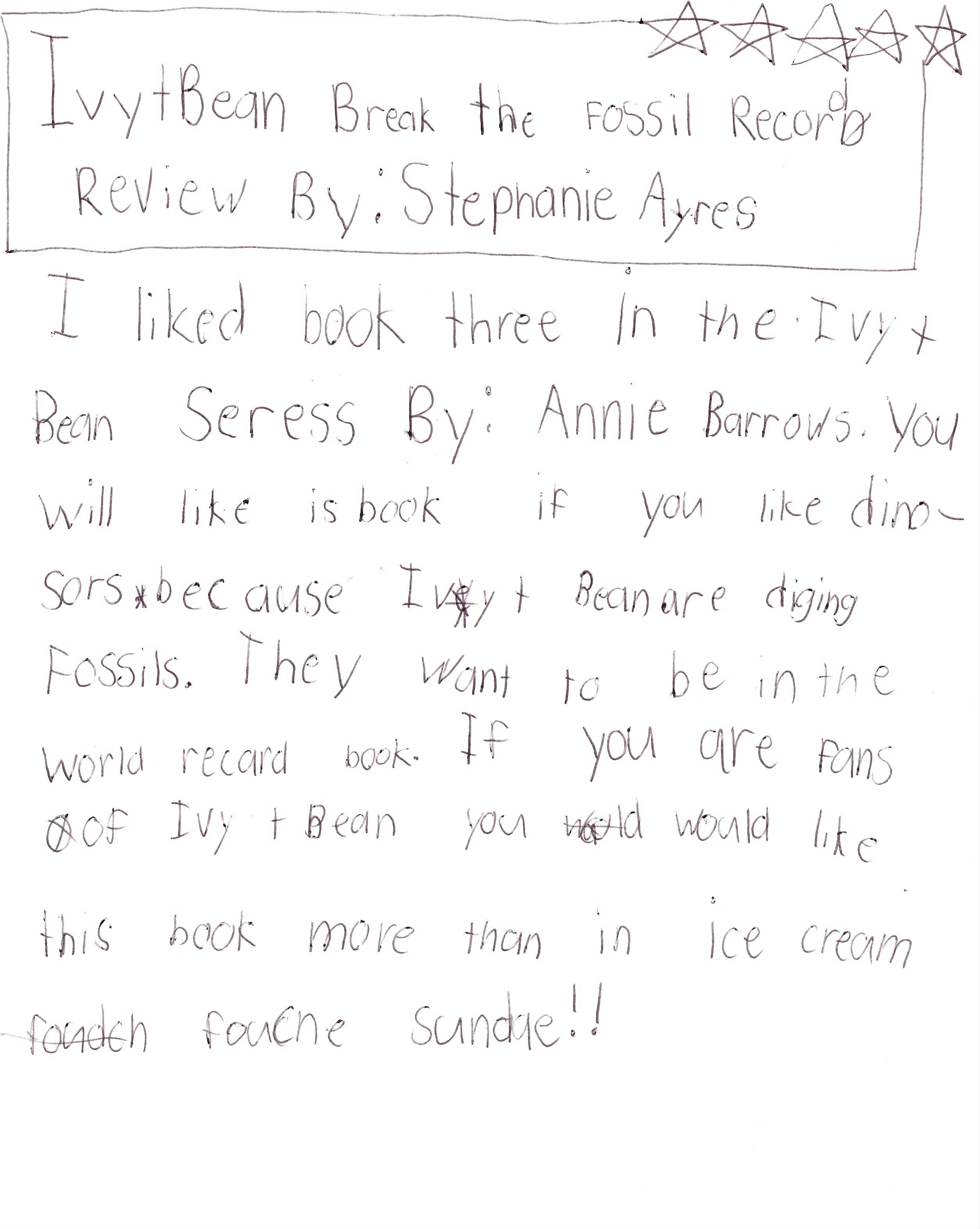 This week my daughter, Stephanie, and I did a little investigating into book reviews. We read several book reviews (and she added some new titles to her wish list). Last week she finished reading book three in the Ivy + Bean series. She decided to try her hand at writing a book review.