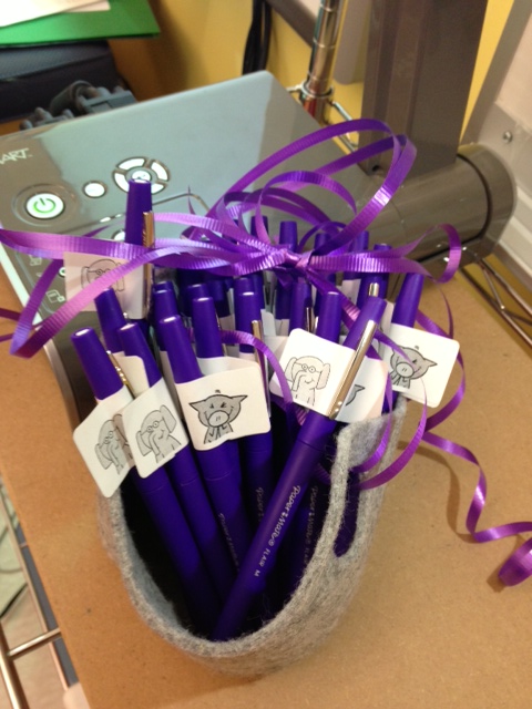 After receiving five boxes of purple, felt-tip pens (that were supposed to be black) I thought, “How am I supposed to use these?” Knowing that my students are in love with all books by Mo Willems, I wrapped the pens in Elephant and Piggie labels, tied some ribbon around them, and when we came back from lunch, there was a package waiting for us!