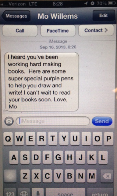 My students were perplexed, “Where did these pens come from?” Just then, “Mo Willems” text my phone; letting me know that he was the one who left us this special gift!