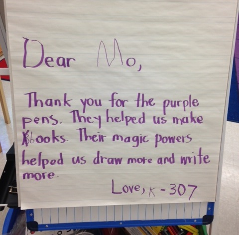 My students are all still convinced that the purple pens have magical powers to help them write and draw. I was even able tuck in some interactive writing in the form of a thank you note to Mo.