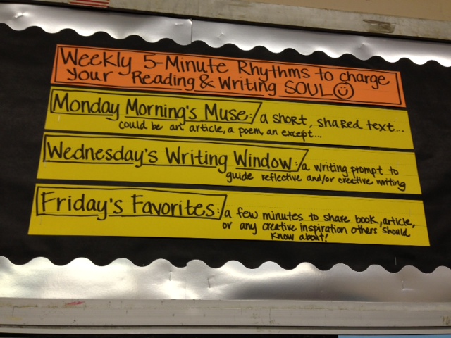I decided to put 3 literary rhythms into place each week, even though they’d take away about 7 minutes from the mere 42 I see them per period. One of them is called Wednesday’s Writing Window and for the first 5 minutes of class I give them a prompt that either encourages them to use writing as a way to reflect and grow in their lives or a prompt that sets them up to write some kind of creative story, poem, or whatever they can think up. Of course, using prompts isn’t totally “independent” writing, but after years of teaching a creative writing after school class I’ve found that kids love them: they see prompts as a challenge and as something that gives them a quick starting place.