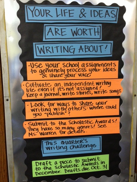 I watched 100 students this Wednesday fill up entire notebook pages in five minutes. When I gave a “bonus minute” to either share or keep writing, the energy that buzzed from both options was palpable. When it was time to move onto our “real” lesson of the day, I reminded to look at the writing bulletin board. Each quarter I have a reading and writing challenge, and the current writing challenge is to submit a draft to me that they can polish and submit to the Scholastic Awards in December. I told them that the prompts we do each week are the perfect way to start that writing, especially if they have ideas for what they just wrote swirling around in their minds.