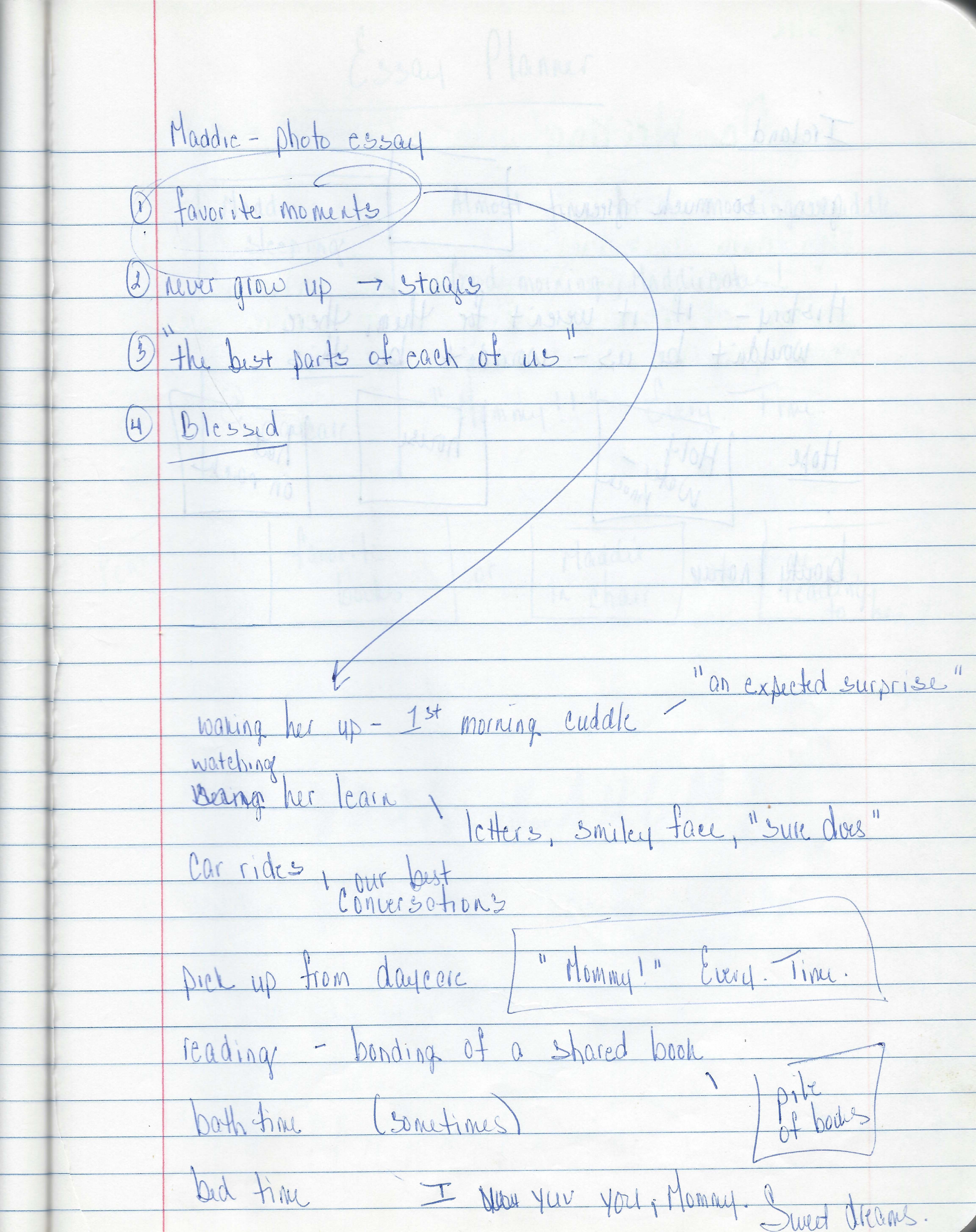 Below is a page from my writer’s notebook where I made a list of possible themes for a photo essay about my daughter. Underneath, I chose one of the themes and made another list of possible pages. Listing can be a great start to a writing project.