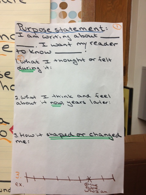 2. Once the groundwork had been laid, and my students are ready to draft, I find that they need to anchor their writing once again to make sure that the “memoir worthiness” is at the heart of their writing – that they know the idea that their memoir writing is built around. So I ask them to write a purpose statement for each of the three memoir moments they will write flash drafts for. Each purpose statement looks like this: