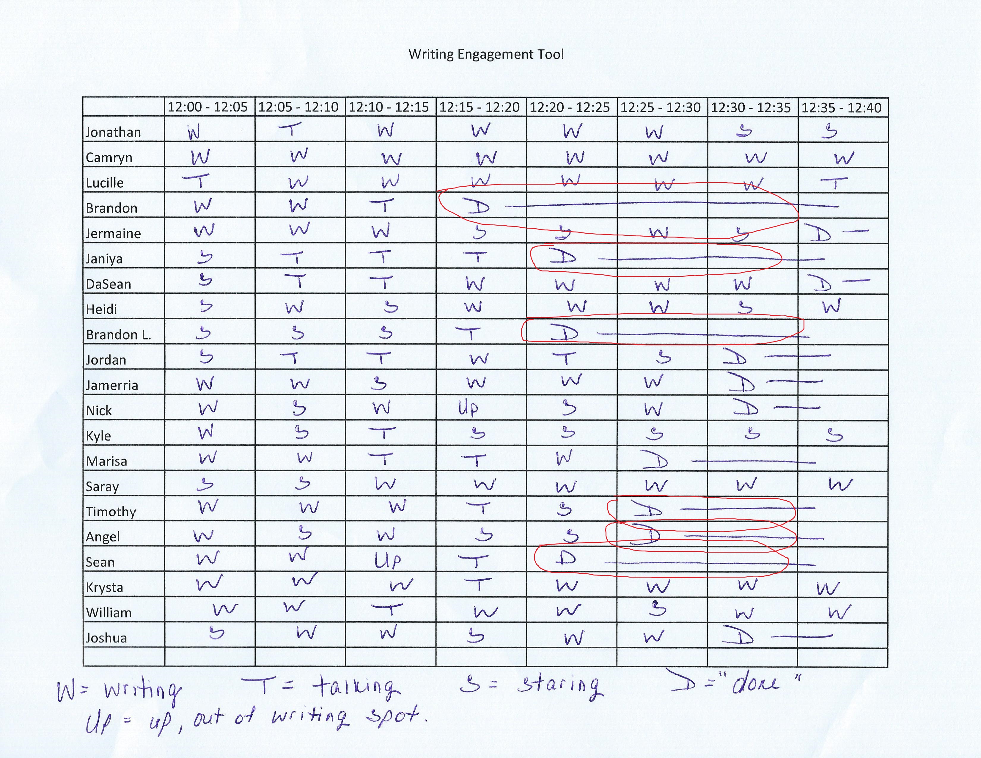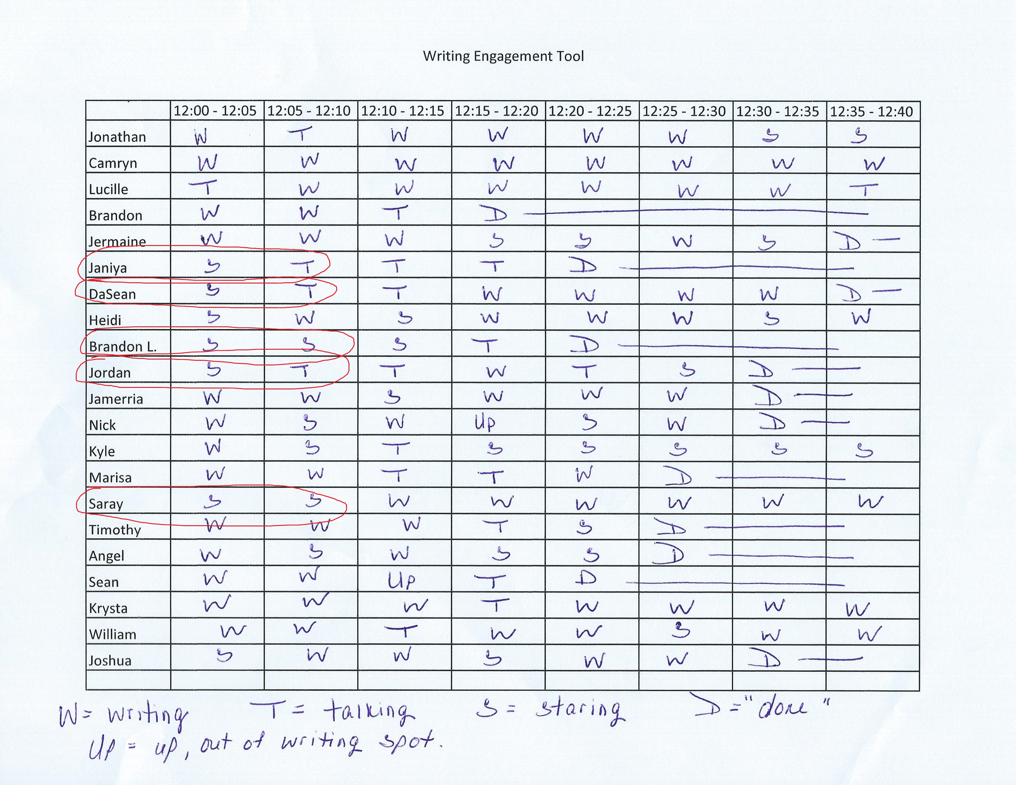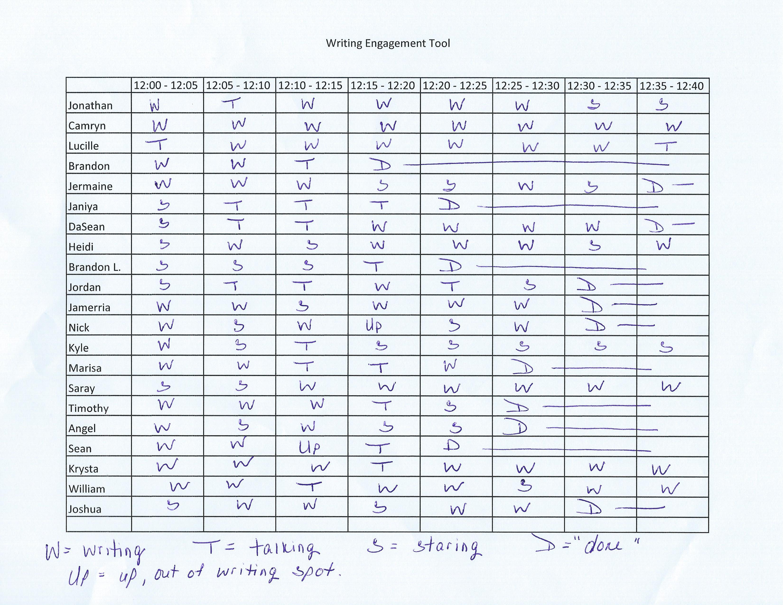 Afterwards, we looked at the data we collected and discussed trends. For example, we plan to observe Janiya, DaSean, Brandon L., Jordan, and Saray more closely in the beginning of independent writing time in the upcoming weeks. According to our observations on this day, they did not do any writing during the first 10 minutes of independent writing time.