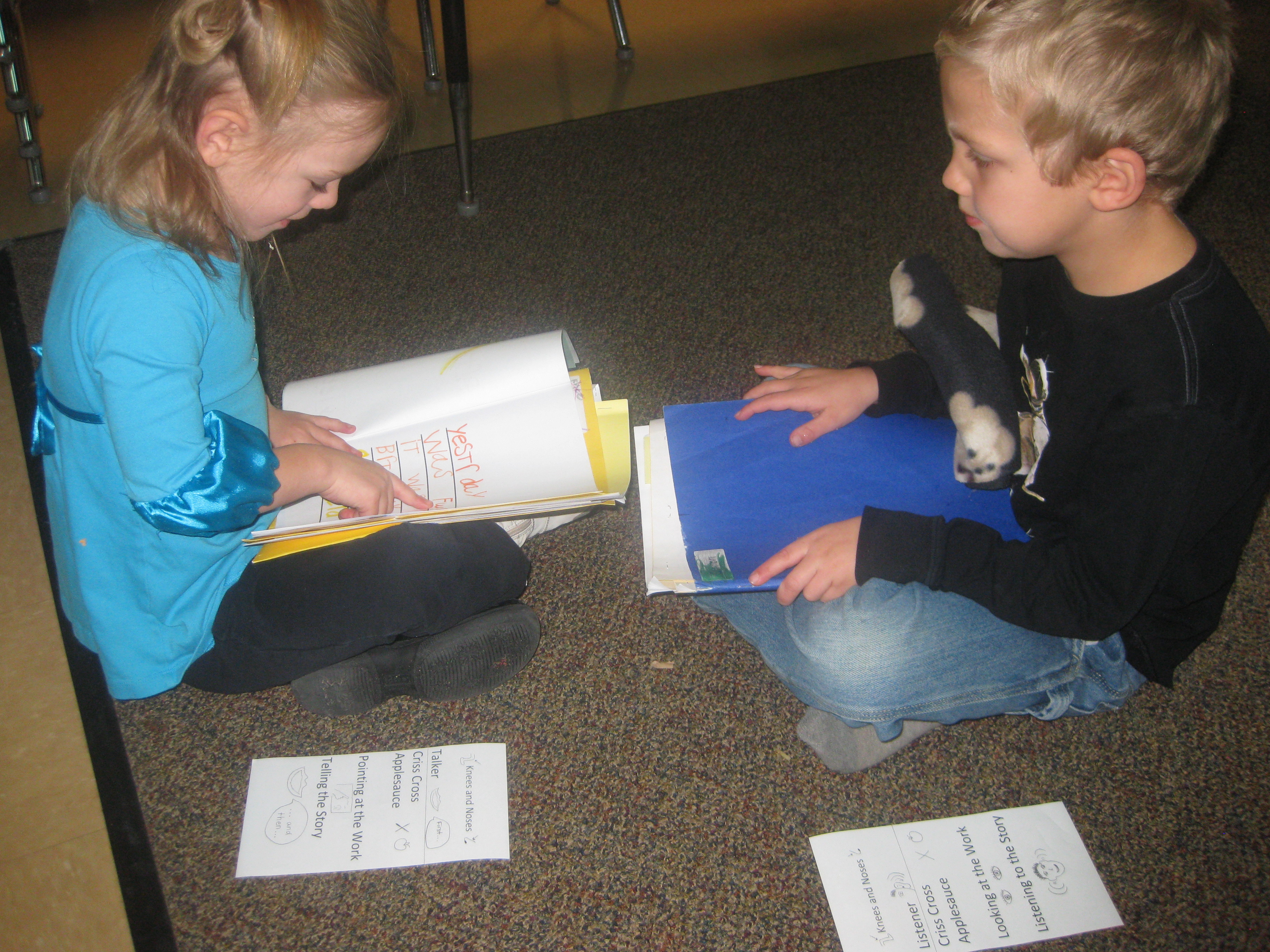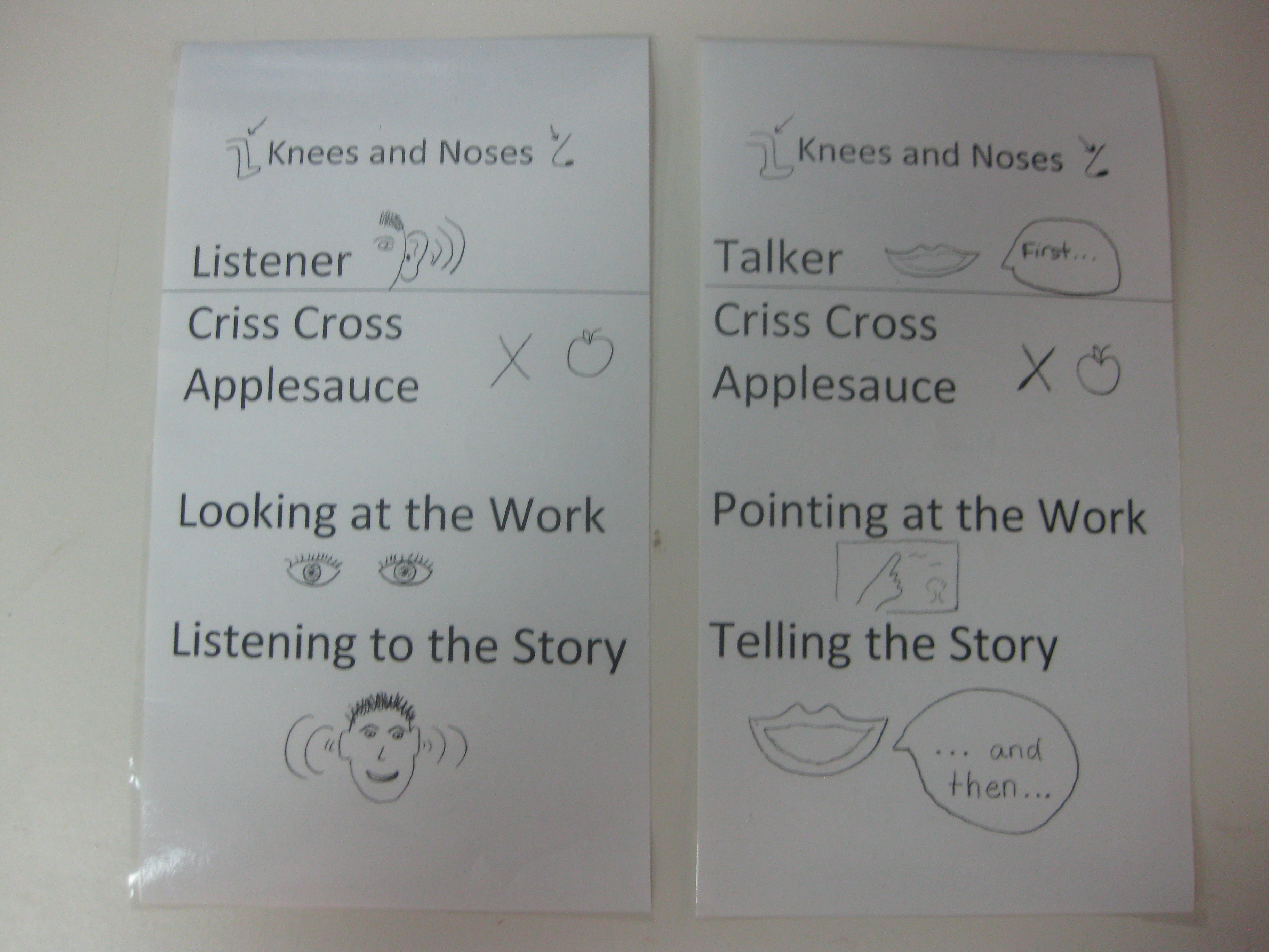 They are using the visuals (shown above) that explain the job of the “talker” and the “listener.” This method began as a classroom chart (shown above) that evolved into individual student visuals to help them stay on track. This can be used during both planning and sharing time.
