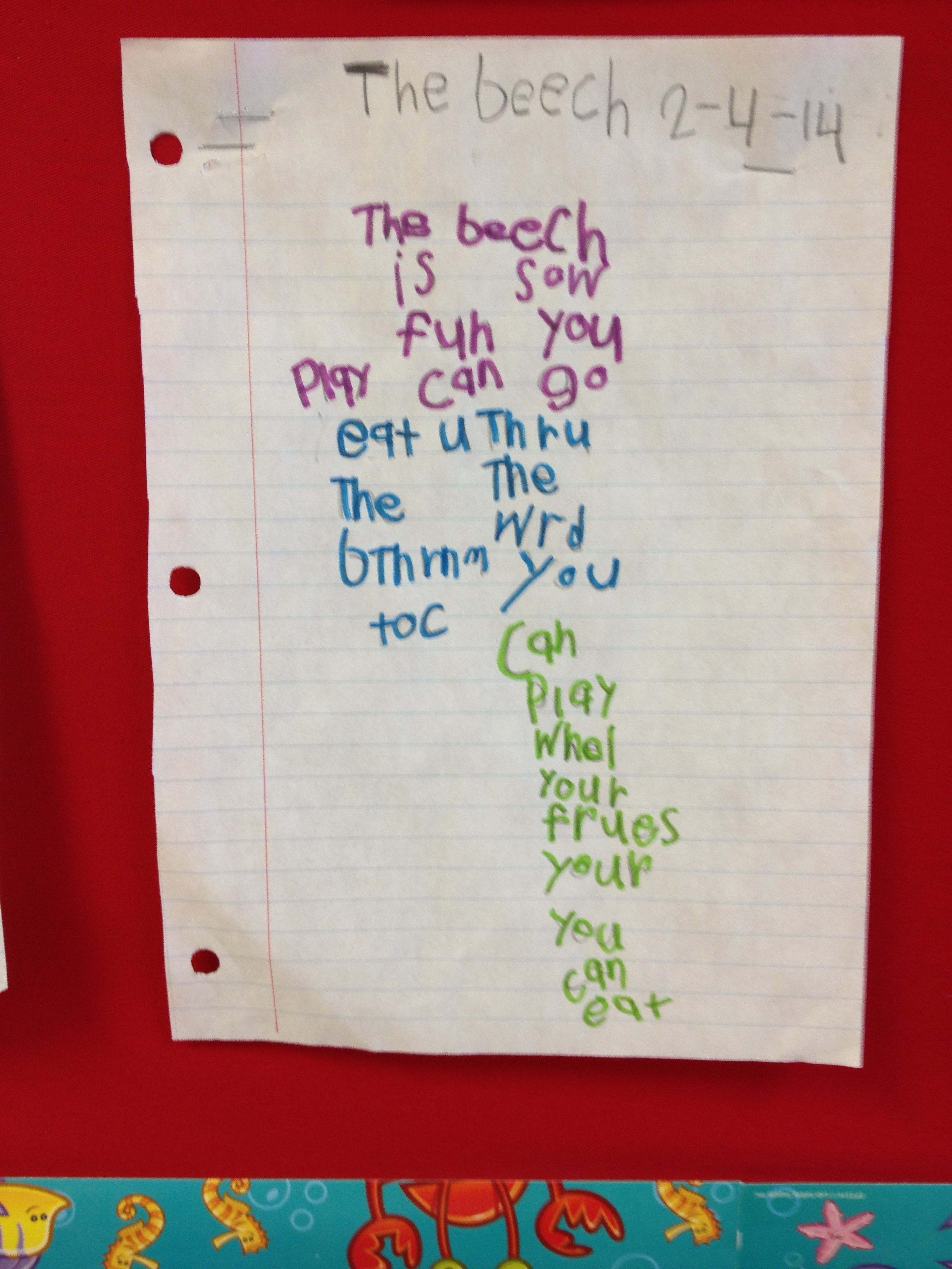 The beach is so fun. You play. You can go eat and through the weird bathroom. You can play with your friends. You can eat.Book Fairs are so fun because you can pick any book you want. The Book Fair is my favorite thing about Parent-Teacher conferences. There is so much books to choose. I love so much the books there. There is a lot of books. I love that.