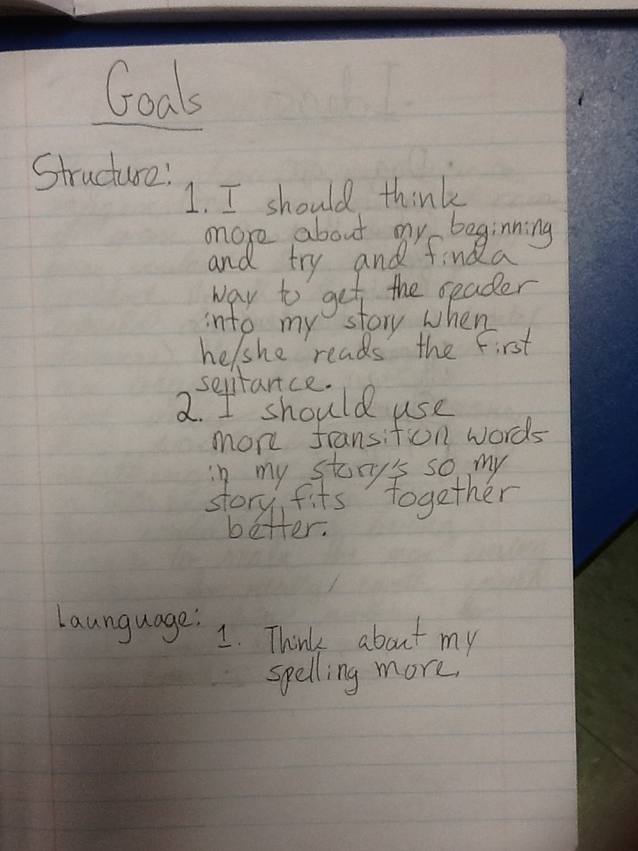 Jessica is also wonderful at guiding her students to do frequent, informal, quick self-assessment. Self-assessment need not be a long, laborious process, and it need not only happen at designated points in a writing unit. In fact, it should be ongoing and, to be most effective, it should be student-led. Jessica’s students use the checklists in the Units of Study for Opinion, Information, and Narrative Writing. They not only place checks in appropriate columns, they follow the suggestion in the Units of Study books to set goals for themselves based on the checklists. Setting goals only takes a few moments, but because the students have to study the checklists come up with ideas, and then put these ideas in writing, they not only have to develop a better understanding of what the checklists really require, they also have to really study their own writing.