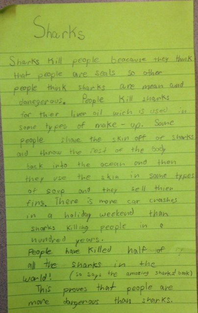 Then, she lists examples from her reading to support her actual point: People kill sharks for their liver oil which is used in some types of make-up. Some people shave the skin off sharks and throw the rest of the body back into the ocean and then they use the skin in some types of soup and they sell their fins. There is more car crashes in a holiday weekend than sharks killing people in a hundred years. People have killed half of all the sharks in the world!
