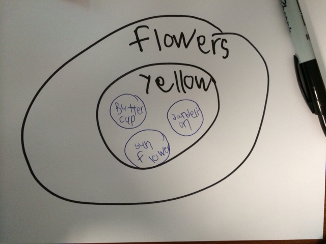 I asked her to make one large circle and pointed to the spot I wanted her to write flowers. Then she drew a circle within that circle. I asked her, “What color flower do you like?” She said yellow and wrote that within the second circle. Then I took a pen and drew three circles. I asked her to think of three flowers that were yellow and write them inside of each circle. Here is the concentric circle model we made together for the class.