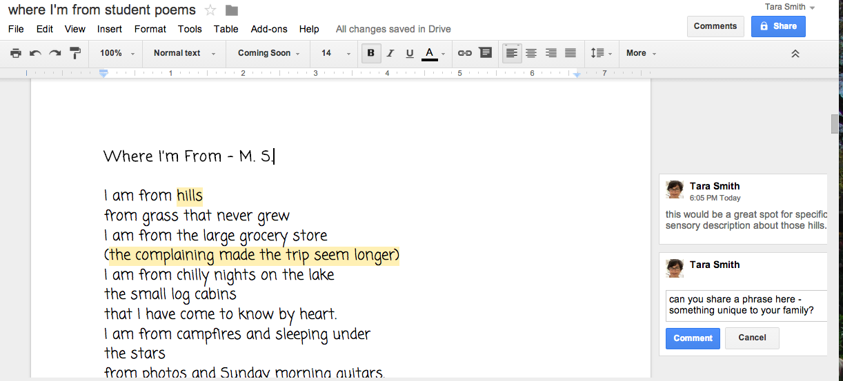 Now, with three weeks of school left, my kids are confident writers who are able to go from first draft directly onto Googledocs in order to confer with me and peer edit with their writing partners. Here for instance is a poem in its final stages of revision, with my comments: