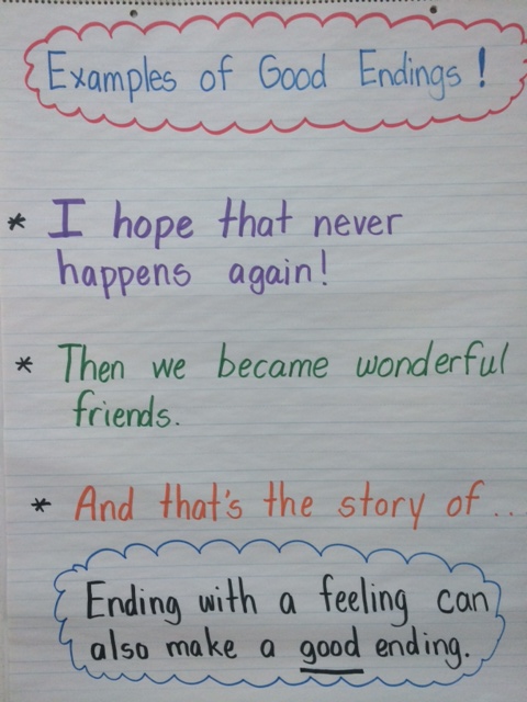 We began by looking at endings that were funny, showed a resolution and endings that restated the topic without offending the reader. Sometimes just restating what happened isn’t enough. We talked about the fact that the reader just determined what the story is about, restating the topic isn’t always necessary, but at certain times it can be appropriate.