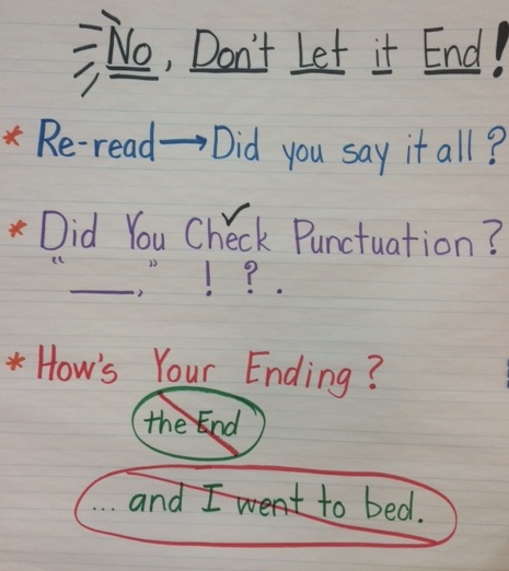 I decided to make a general chart first that reminded students to check on a few things and wrapped up with checking the ending. I wanted them adding this to their revising and editing routine. It was easier to talk about what NOT to do and wait to see what students DID do.