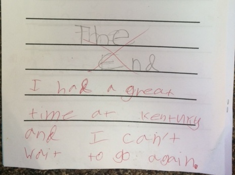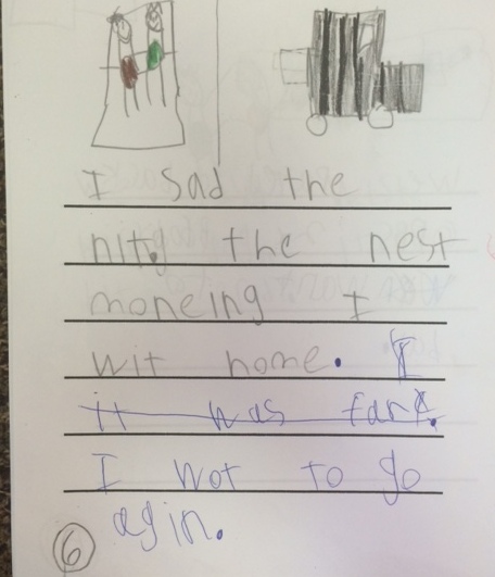 He also had “It was fun,” as an alternate but crossed it out. We talked about how it might be okay to leave it in the story since adding a feeling can also be a way to wrap up a story.
