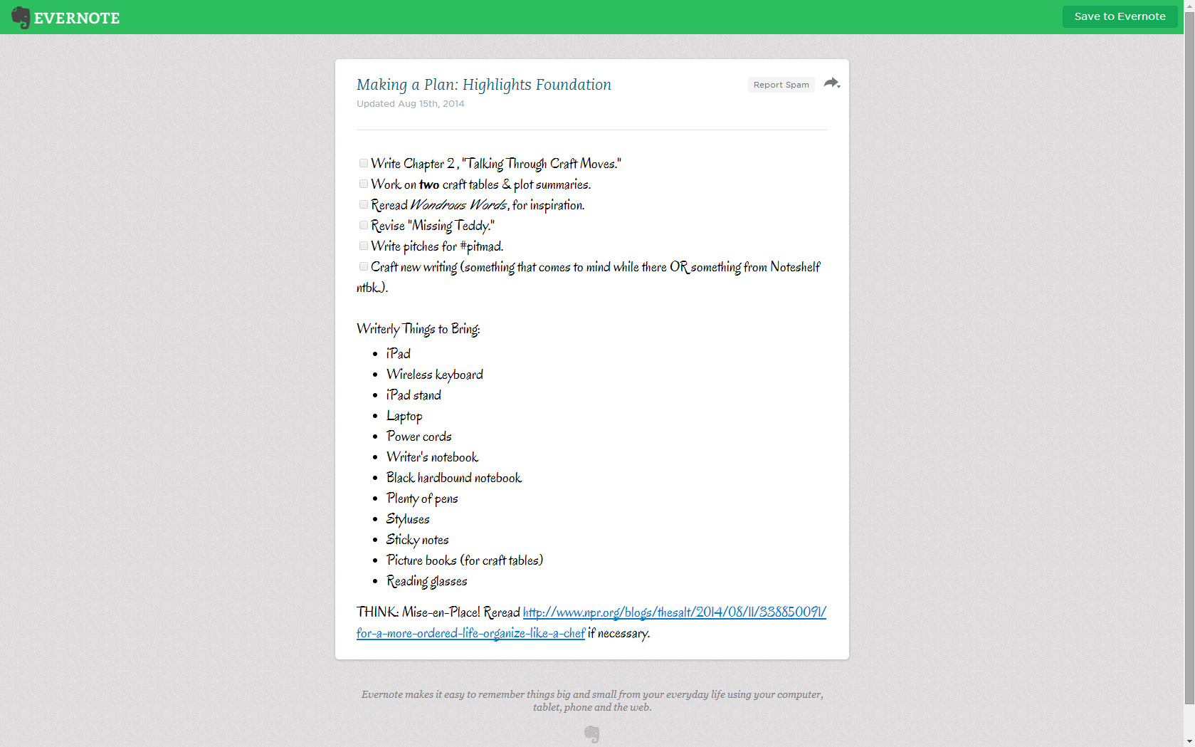 I got antsy as the Unworkshop approached. First, I worried I was going away for too long.  (Up until the Unworkshop, I had never been away from my daughter for more than three nights.)  Second, I worried I wasn’t going to have enough time to accomplish everything I wanted to accomplish.  Third, I worried I was going to forget something I needed. Therefore, I made a checklist of what I wanted to accomplish and the writerly things I needed to bring the day before I left.