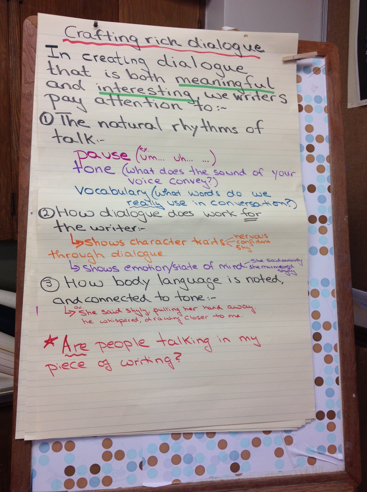 The very next day, I aimed to change my errant ways.  We began with our usual minilesson – one on crafting dialogue: