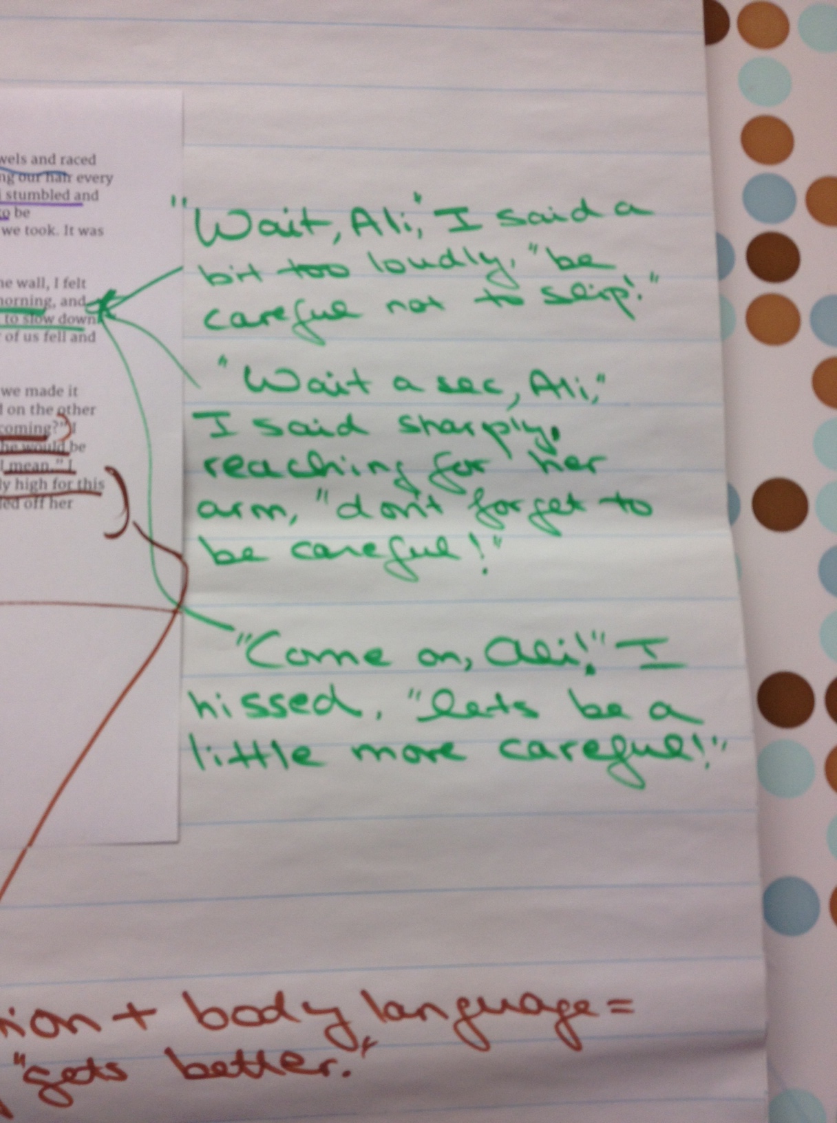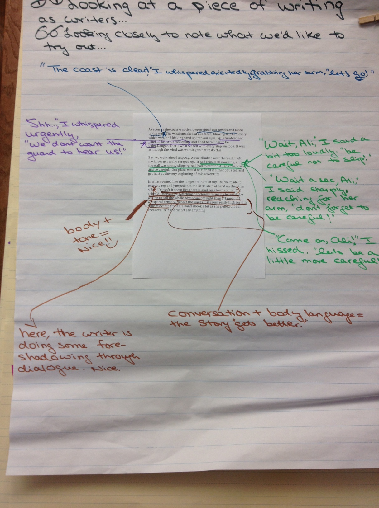 Mary suggested using snippets of our own writing, but reminded us that we need to be restrained in our own writing, keeping in mind the purpose of this type of demonstration writing: “you are not trying to be good writers, you are trying to get better in front of them.” Some steps she taught us using the insertion of meaningful dialogue:
