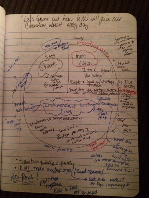 Mary led us through an example of this type of work, which led to one of those “ah-ha moments” I have come to expect from her workshops.  Of course.  So many times, I have written in front of my kids, trying to get across some vital teaching point, and then been frustrated when I didn’t see evidence of this teaching point in their writing.  They had left our meeting area having been able to point out this or that writing move in the demonstration piece, without having had enough of an opportunity to practice it themselves – to see the piece getting better right in front of their eyes.  Of course!