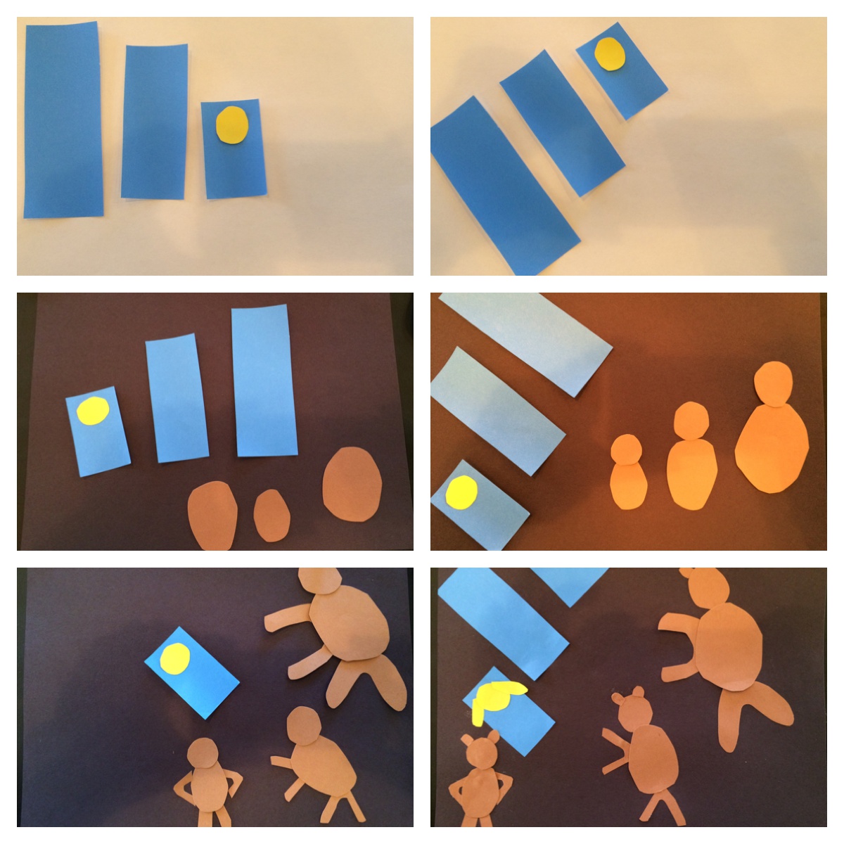 Once we learned about Bang’s principles, we had the chance to make some artwork of our own using the principles. We were given four colors of paper and were tasked with illustrating a moment in a fairy tale. It sounds easy, right? Not for me! With only 45 minutes to create a piece of visual art that reflected Bang’s principles, I got a taste of just how challenging it is to be an effective illustrator. Here’s a peek at some of my attempts to recreate a scene from “Goldilocks and the Three Bears”: