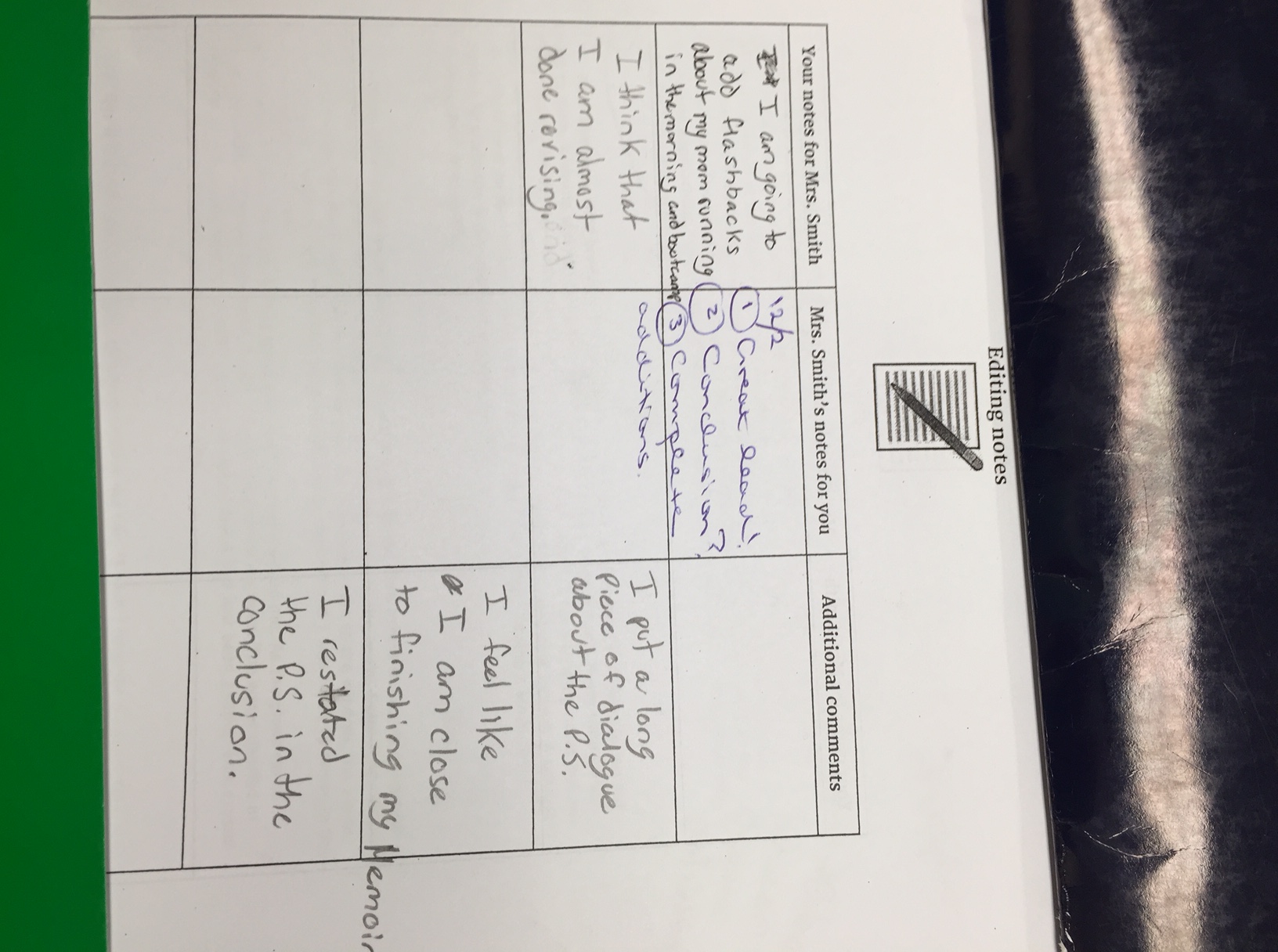 - Once they were at their desks, many of my kids seemed to have forgotten the purpose of their editing sheets. My students use these to make notes at the end of each writing workshop, which I review and respond to before we meet again. This way, each student has a game plan for writing workshop – they know what they need to attend to while I am making my conference rounds: