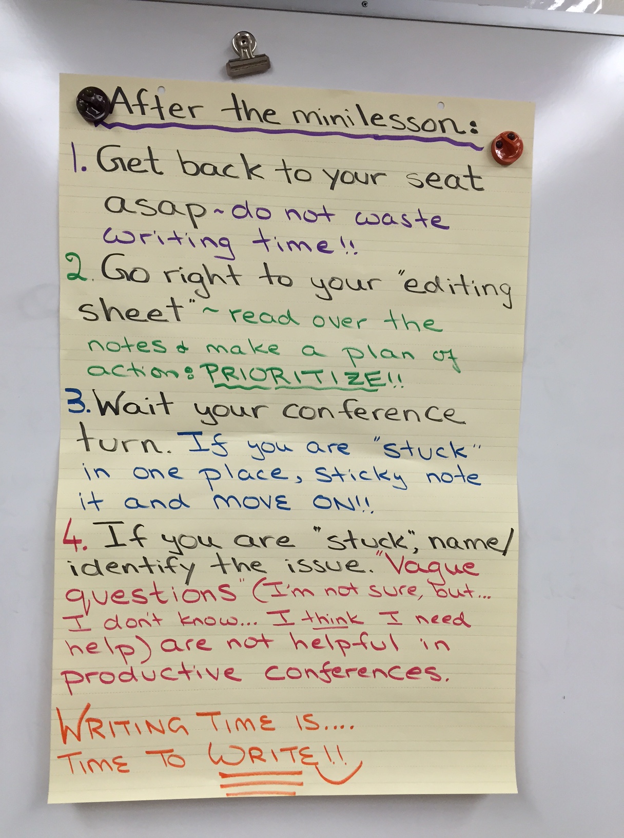 - Conference time is precious. It’s my job to be be able to help my kids identify specific issues and areas of improvement, but it’s also my kids’ job to be able to name a writing issue they are struggling with when they request a conference. On Monday, it seemed as though my kids were requesting conferences just to chat. I love chatting with my kids…but not during writing conferences. During writing conferences, I want to chat about a specific piece of writing right there on the desk in front of us.