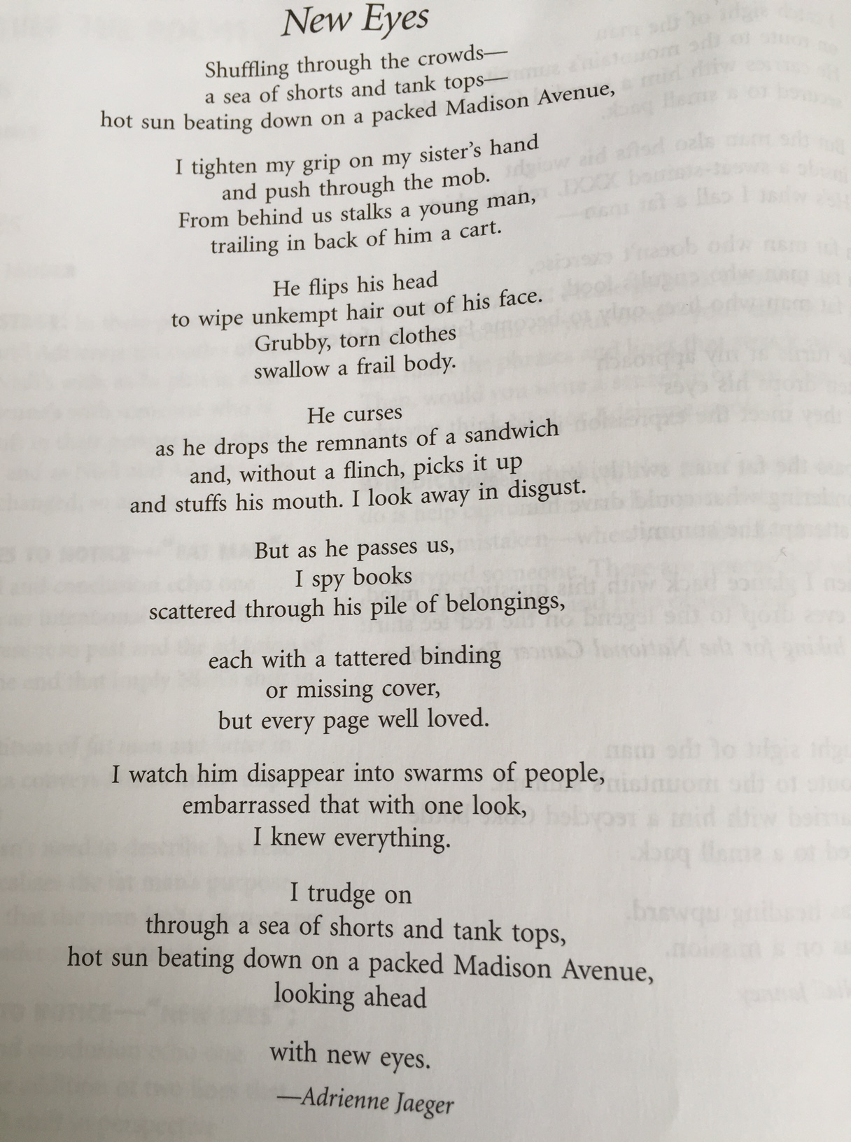 The week before last, we read Adrienne Jaeger’s “New Eyes”: