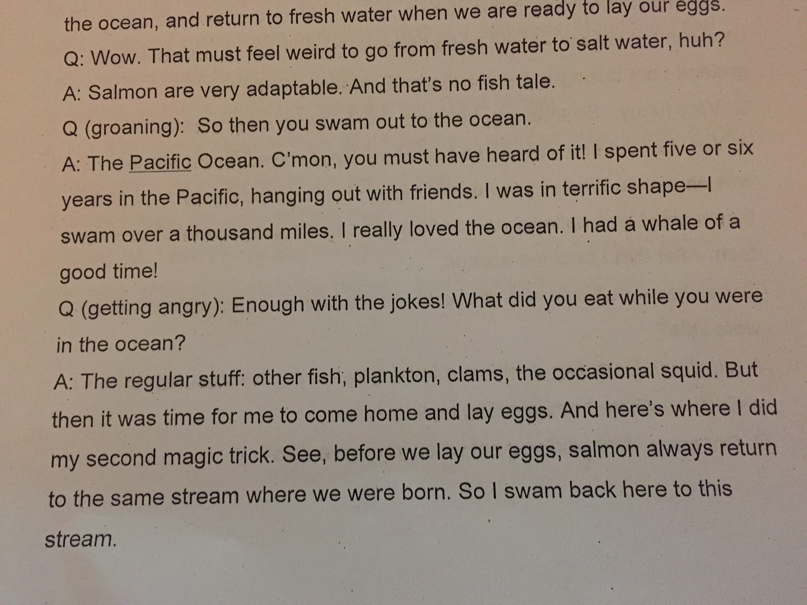 The Monday morning after Ralph Fletcher’s presentation on Authentic Information Writing at Vassar College, I gathered my sixth graders at our reading area and shared what I had heard and learned, then we read Fletcher’s “Interview With a Coho Salmon”: an information article about the life cycle of this type of salmon written in an interview format, replete with corny jokes and lots of information: