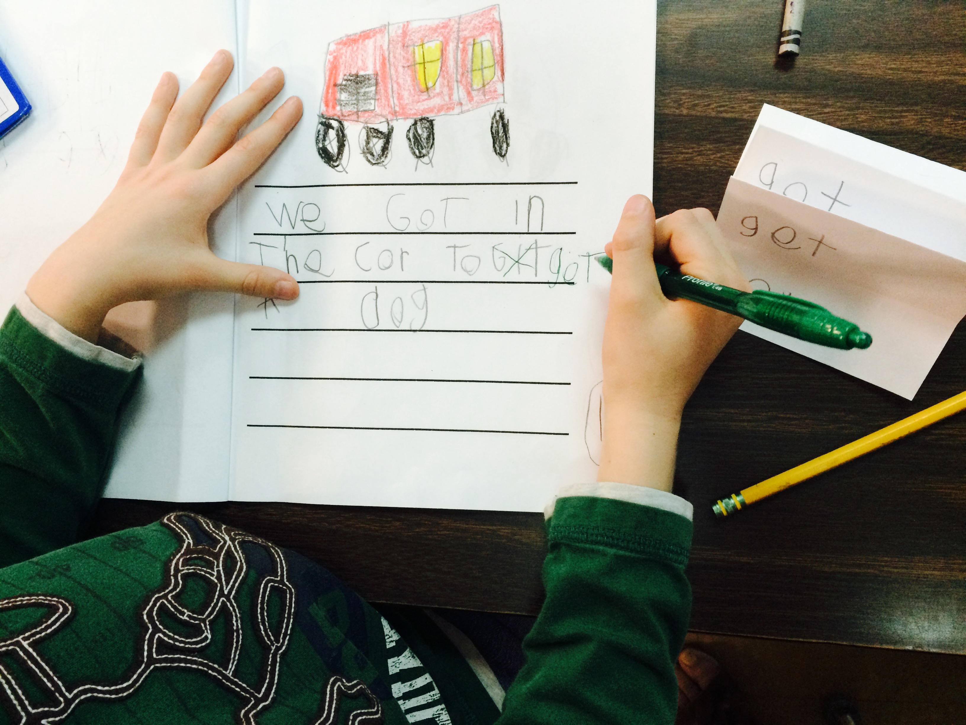 QUICK-FIX SPELLING! This is just an ordinary strip of paper folded like a fan. I keep these handy during a conference when I notice a commonly used word misspelled over and over again in a student’s writing. For instance, Josh (below) was really close to spelling the word “get,” but continually through one story had it spelled, “git.” Understandable for a six-year old. However, it was clear to me that he was ready to learn how to spell this word based on his close approximation. This led to an opportunity to share the spelling of the word, allowed him to practice it multiple times and then he went back into his piece like a detective to edit this word throughout the story.