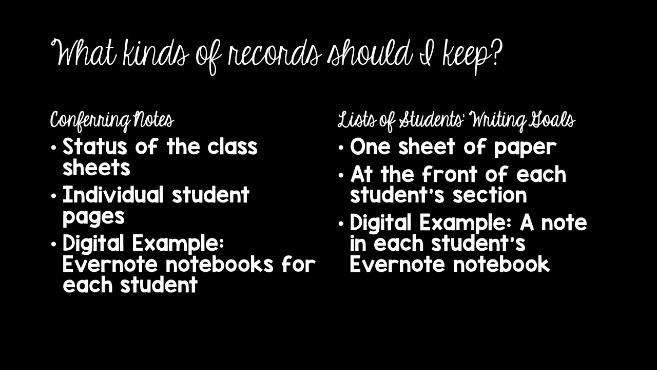 It was sloppy. No one could read it. But no one had to since my notes were for my own use to monitor and track student progress. Once I left the classroom and began leading presentations on conferring with teachers, I updated them my forms so they’d look slicker. (Click here or here to see these forms.) While handwritten notes worked for me when I was in the classroom, I don’t think I’d go back to them again since I have become comfortable with digital record-keeping in the past two years.